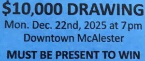DO YOU WANT TO WIN 50 $10,000 DRAWING TICKETS? THE 10 K CHRISTMAS CASH GIVEAWAY IS HAPPENING ON MONDAY, DECEMBER 22ND, AND MCALESTER RADIO IS GIVING YOU A CHANCE TO 50 10K DRAWING TICKETS!  FILL OUT THE FORM BELOW TO ENTER FOR YOUR CHANCE TO WIN! WE WILL GIVE ONE LUCKY WINNER 50 DRAWING TICKETS EVERY MONDAY THROUGH DECEMBER 15TH! YOU CAN ENTER YOUR NAME ONCE A DAY TO INCREASE YOUR CHANCES!